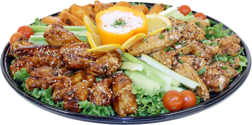 Three full-flavored chicken wings: TERIYAKI, FRANK'S HOT SAUCE, and SWEET CHILI SAUCE. Served with celery strips and cherry tomatoes with ranch dipping sauce.