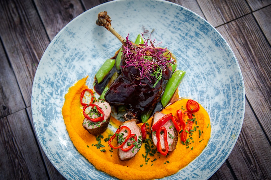 Place duck breast skin side down in oven proof sauté pan on medium heat. Render skin on stove top then transfer to oven for 8-10 minutes. Remove duck breast from pan and let rest for 5 minutes. In the same pan you cooked the duck sauté the sugar peas in duck fat add a bit of butter and season with salt and pepper. Remove duck legs from fat and cook in oven until skin is brown. Then assemble plate