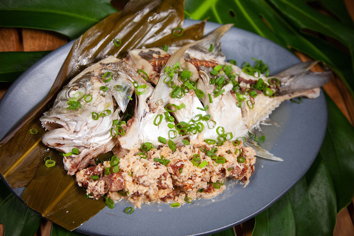 - Scale, gut, salt and steam the fish (put about 1/2 inch of water in the pot, keep fish above it over a colander.)