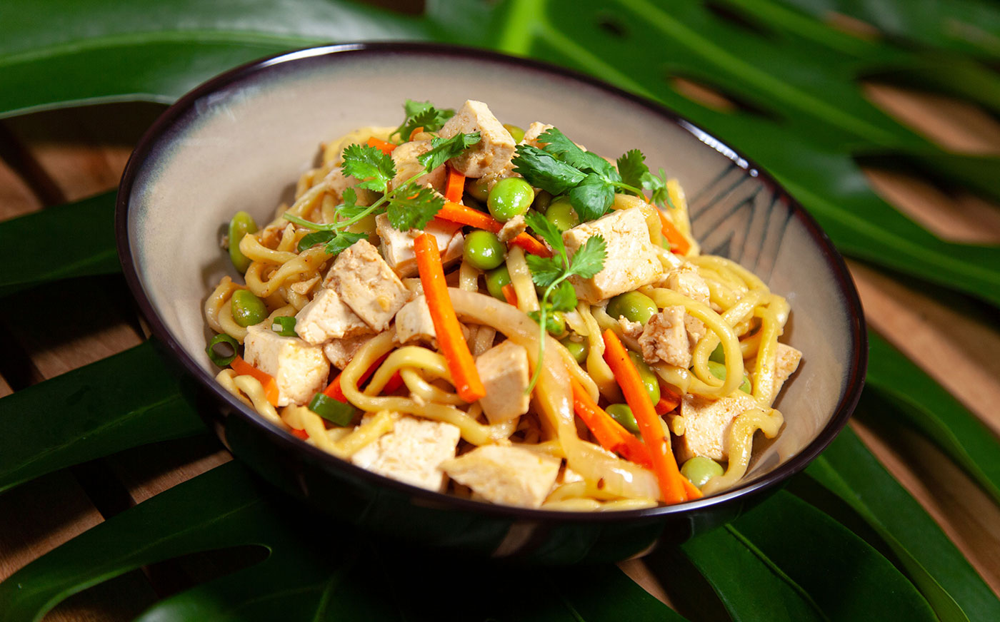 - Add the tofu and pan fry for 5-7 minutes, stirring occasionally.