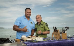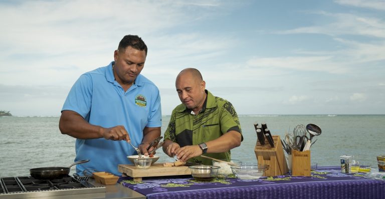 Super bowl champion Maa Tanuvasa joins us this week in the Cooking Hawaiian Style kitchen. The Retired NFL defensive end has 2 Championship rings and spent most of his career with the Denver Broncos. He was drafted in the 8th round by the Los Angeles Rams in 1993 but after his rookie year spent 1 year with the Pittsburg Steelers. He really made some noise in the NFL as he led the Broncos with the most sacks in 1998 and 1999. He was then inducted into the Hawai’i Sports Hall of Fame in 2006. I was lucky enough to meet Maa during his career with the Broncos, as he would visit my radio show often in his off season. Today we are lucky enough to have Maa in our kitchen making Uala Chips.