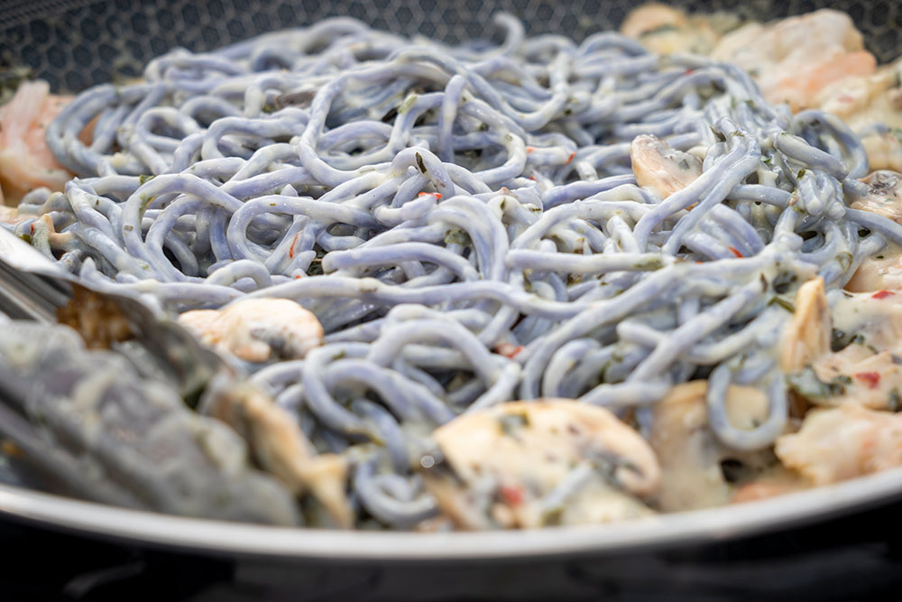- Place the sauce from the pot on a flat-top skillet, add the noodles and sauté.